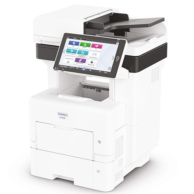 Ricoh IM600F, multifunctional A4 mono, 60ppm, 43ppm in duplex, copy/print/scan/fax, single pass SPDF (DADF) 50 coli, rezolutie print 1200x1200dpi, copy 600x600dpi, PCL5 si 6/PS3/PSD, fco 2,4s, procesor 1,3GHz, memorie 2GB + 320GB HDD, alim 100+500 coli (max 2600), iesire 500 coli, paper 64-120gsm, duty 275/luna, recomandat 16667p/luna, toner start 11000p, USB/Ethernet Gigabit/Bluetooth/NFC/SD slot (opt WiFi), touch screen 10.1", TEC value 0.84 kWh/week, scan speed 60ipm mono, 100ipm mono duplex/40ipm color, 62ipm color duplex, scan to E-mail, Folder, USB, SD Card, scan format TIFF, JPEG, PDF, High Compression PDF, PDF/A, warm up 25,4s, consumabile: toner 418478 (25,5k), toner 418481 (40k), cilindru M0CH3051 (500k), dimensiuni 48×53,9×64,4 cm, greutate 29kg, garantie 12 luni, on depot.
