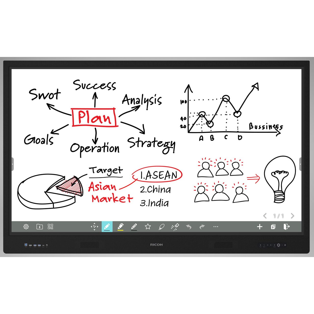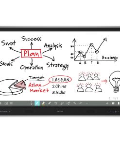 Ricoh Interactive WhiteBoard IWB A6510 – display 65" (165cm), 4K UHD, landscape 16:9, memorie RAM 8GB, stocare ROM 128GB, ecran disponibil efectiv 1,428 x 803mm, rezolutie 3,840 x 2,160 dot, rezolutie interpolata 32768×32768, brightness 400cd/mp, contrast 5000 : 1, pixeli 0.124 x 0.372mm, colors 1,070,000,000, timp de raspuns 6.5ms, refreshing frequency 60Hz, view angle 178/178, LED lifetime 50000h, accuracy/precizie 1mm, functionare 18h/zi, OPS slot, senzor lumina, NO motion detection sensor, NO dust resistant, rear interface: USB A x 3, USB C x 1, USB B x 3, HDMI In x 2, DisplayPort x 1, OPS Slot x 1, RS232 x 1, Audio Out x 1, Line out or Headphone x 1, SPDIF x 1, HDMI Out x 1, LAN 1000Base-T x 2, front interface: HDMI x 1, USB C x 1, USB A 3.0 x 2, USB B 3.0 x 1, MIC In x 1, conectivitate wired LAN/WiFi 5,6/Bluetooth 5.2, multi touch in Windows/Android, single touch Linux/Chrome, grosime protection glass cu AR coating 3,2mm, sticla securizata anti-glare AG, anti-fingerprint AF, hardness 8H, up to 40 touch points, Wireless screen sharing, rama frontala aluminiu/ spate metal, culoare negru. Consum standard 200W, ECO mode 133W, cu OPS 380W, stand by 0,5W, audio 2 x 15W, 8 OHMI, Android 13 & Google EDLA, aplicatii preinstalate: Whiteboard, Picture-In-Picture, Eshare, Browser, Settings, Google Play Store, Google Calender, Files by Google, Search, Chrome, Gmail, Maps, YouTube, Drive, YT Music, Google TV, Meet, Photos. Energy Star certified. Accesorii incluse: 2 x touch PEN, telecomanda, cablu alimentare, USB type C (2m), HDMI 2.0 (3m), USB A-B 3.0 (3m), plastic clamps 3+3buc, 2 x baterie AAA. Prindere VESA 4buc x – M8 screw hole 600 x 400 mm. Dimensiuni 1,513 x 93 x 953mm, greutate 40kg, FARA suport de perete sau stand mobil.