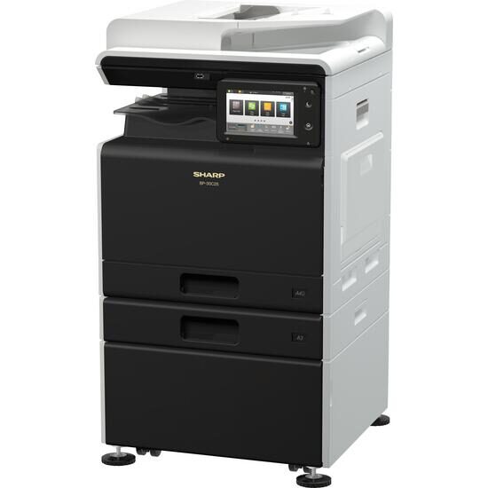Sharp BP30C25, multifunctional A3W color, 25ppm A4, 14ppm A3, 25ppm A4 in duplex, copy/print/scan, RSPF (DADF) 100 coli, rezolutie print 600x600dpi / 9600x600dpi, copy 600x600dpi, PCL6 (opt PS3), fpo/fco 11s color – 8s mono, procesor quad core 1,4GHz, memorie 5GB, SSD 128GB, alim 100+250 coli (max 1850), iesire 250 coli, paper 55-256gsm, duty 84k mono – 36k color/luna, recomandat 2100p mono – 900p color/luna, USB/Ethernet Gigabit (opt WiFi/NFC), touch screen 7", TEC value 1.2 kWh/week, scan speed 52ppm/20ipm duplex, scan to E-mail, FTP, Shared folder (SMB), Local Drive, USB, opt Desktop, Fax, scan format TIFF, PDF, Encrypted PDF, JPEG, XPS, opt Compact PDF, Searchable PDF, OOXML(pptx, xlsx, docx), TXT, RTF, warm up 18s, toner lock (blocare scoatere), serverless follow-me print, two LAN support, consumabile: toner black BPGT30BB (10k), BPGT30BA (20k), cyan BPGT30CB (7.5k), BPGT30CA(15k), magenta BPGT30MB(7.5k), BPGT30MA(15k), yellow BPGT30YB(7.5k), BPGT30YA(15k), drum BPDR20SA (120k), developer black BPGV20BA (120k), color BPGV20SA (120k), waste BPHB200 (30k), dimensiuni 57 x 63 x 65,3 cm, greutate 54kg, garantie 12 luni, on site.