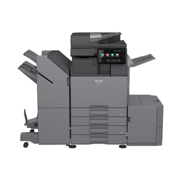 Sharp BP51M26, multifunctional A3W mono, 26ppm A4, 15ppm A3, 26ppm A4 in duplex, copy/print/scan, RSPF (DADF) 100 coli, rezolutie print 600x600dpi / 9600x600dpi, PCL6, PS3, fpo/fco 6.2s, procesor quad core 1,6GHz, memorie 5GB, SSD 128GB (opt 512GB), alim 100+550 coli (max 6300), iesire 500 coli (max 620), paper 52-300gsm, standard banner 305-1300mm, duty 200k/luna, recomandat 4400p/luna, USB/Ethernet Gigabit/NFC (opt WiFi+Bluetooth), touch screen 10.1", serverless follow-me print, Microsoft Entry ID Authentication , two LAN support, TEC value 0.31 kWh/week, scan speed 80ppm/25ipm duplex, scan to USB, Local Drive, E-mail, FTP, Shared folder (SMB), opt Desktop, Fax, scan format TIFF, PDF, Encrypted PDF, JPEG, XPS, opt Compact PDF, Searchable PDF, OOXML(pptx, xlsx, docx), TXT, RTF, warm up 13s, consumabile: toner BPGT700 (40k), developer BPGV700 (400k), cilindru BPDR700 (200k), drum unit BPDU700 (200k), waste BPHB701 (300k), dimensiuni 60,8 x 65,3 x 82,9 cm, greutate 64kg, garantie 12 luni, on site.INSTALARE GRATUITA.