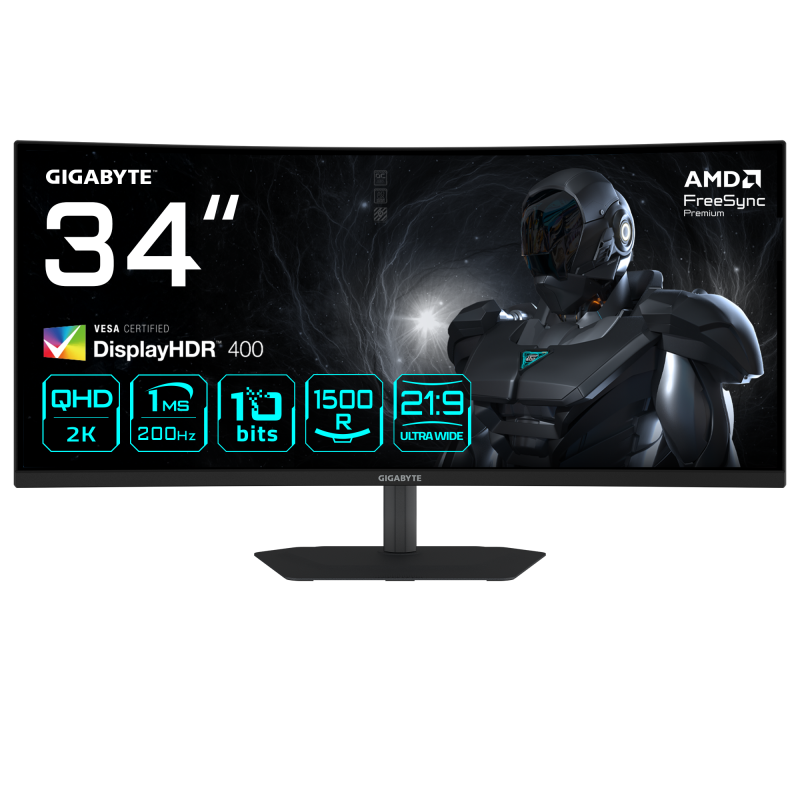 GIGABYTE G34WQC2 34” WQHD Curved Gaming Monitor – 3440 x 1440, 1500R, 200Hz, 1ms, 450 cd/m2, AMD FreeSync Premium, DisplayHDR 400, HDMI 2.0, Displayport 1.4. Display diagonal: 86.4 cm (34″), Display resolution: 3440 x 1440 pixels, HD type: UltraWide Quad HD, Display technology: LED, Display surface: Matt, Response time: 1 ms, Native aspect ratio: 21:9, Viewing angle, horizontal: 178°, Viewing angle, vertical: 178°. Built-in speaker(s). VESA mounting, Height adjustment. Product colour: Black
