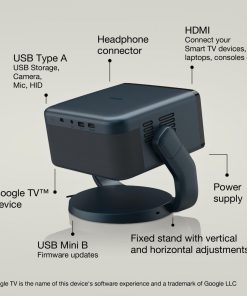 Proiector Epson EF-22N Proiector compact + stand, cu proiecte de pana la 150″, Tehnologie 3LCD, LCD 0.62″, 1000 lumeni (500 mod economic), Full HD, Aspect: 16:9, Contrast: 5.000.000 : 1, Sursa lumina: Laser, Durata de viata sursa lumina: 20.000 ore, Refresh rate: 200 Hz – 240 Hz, 16.77 Milioane culori, HDR10, dimensiune proiectir: 30-150″, Google TV, Interfata: USB, jack, HDMI, consum energie: 108 W, 78W ECO, Dimensiuni: 236 x 191 x 193 mm, 3kg, difuzor integrat 5w, stereo, telecomanda inclusa, culoare: Mettalic Blue.